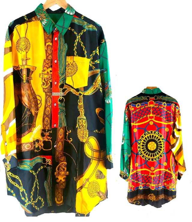 高級感漂うスカーフ達を組み合わせ ポップで個性的なデザインが特徴です。背面に施された幾何学模様や、お袖のドッグ柄は犬好きの方々に特におすすめのデザインです。ワンピース風に着こなすと、さらにおしゃれさが引き立ちます。 環境に配慮しながらも、高品質で斬新なデザインを実現しています。 おしゃれを楽しみながら、地球に優しい選択をすることができるこのアイテムを、ぜひ手に入れてみてください。 ※このアート作品は同じデザインは二つとして存在しません。ビンテージスカーフはデリケートな素材ですので、お取り扱いには十分ご注意ください。
