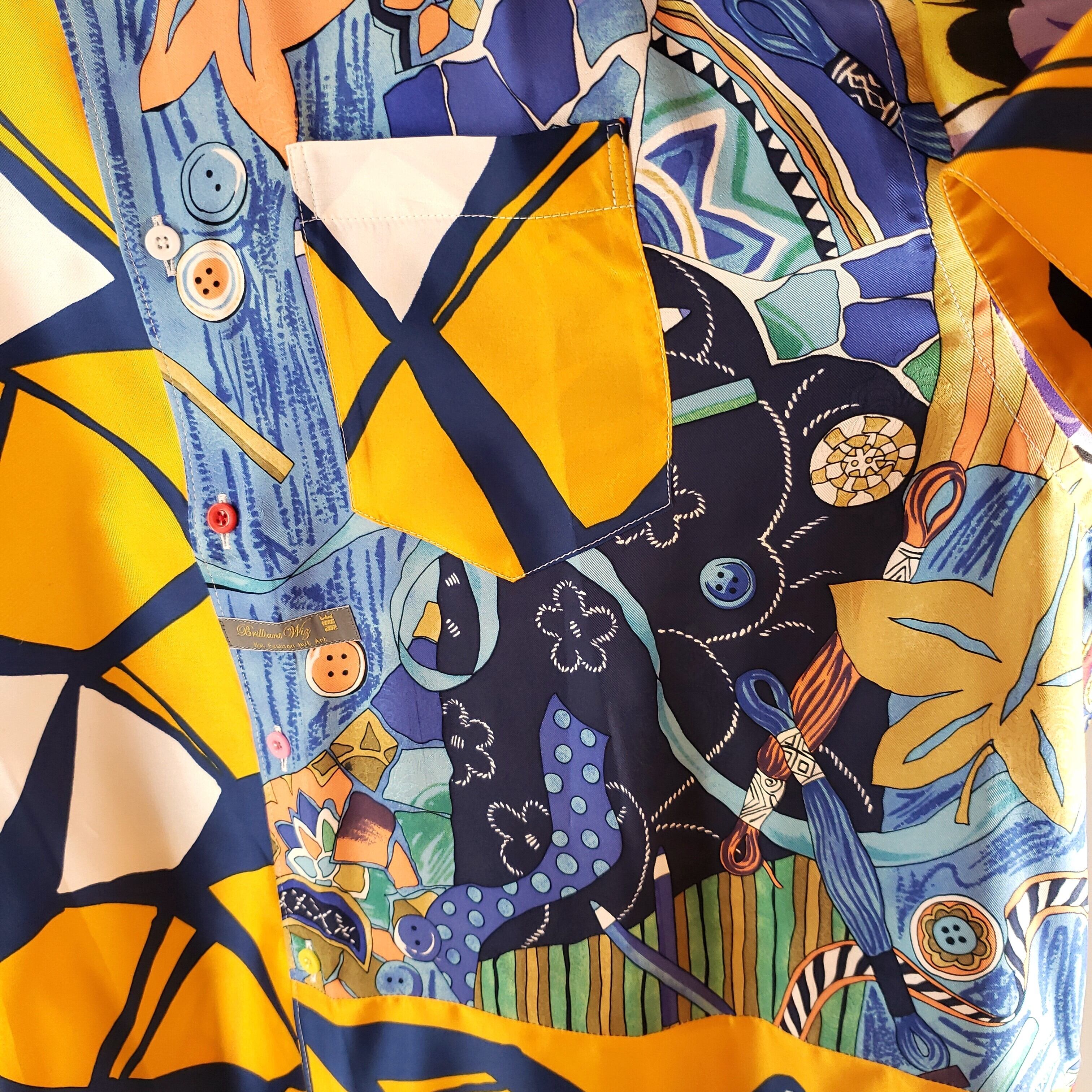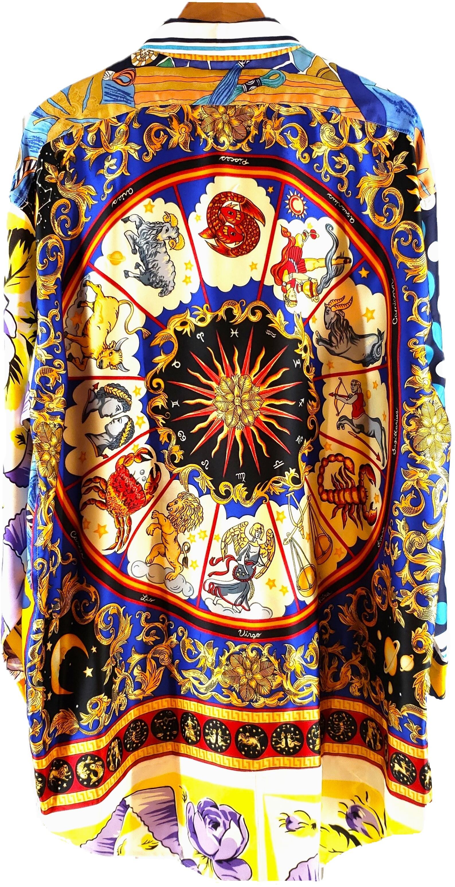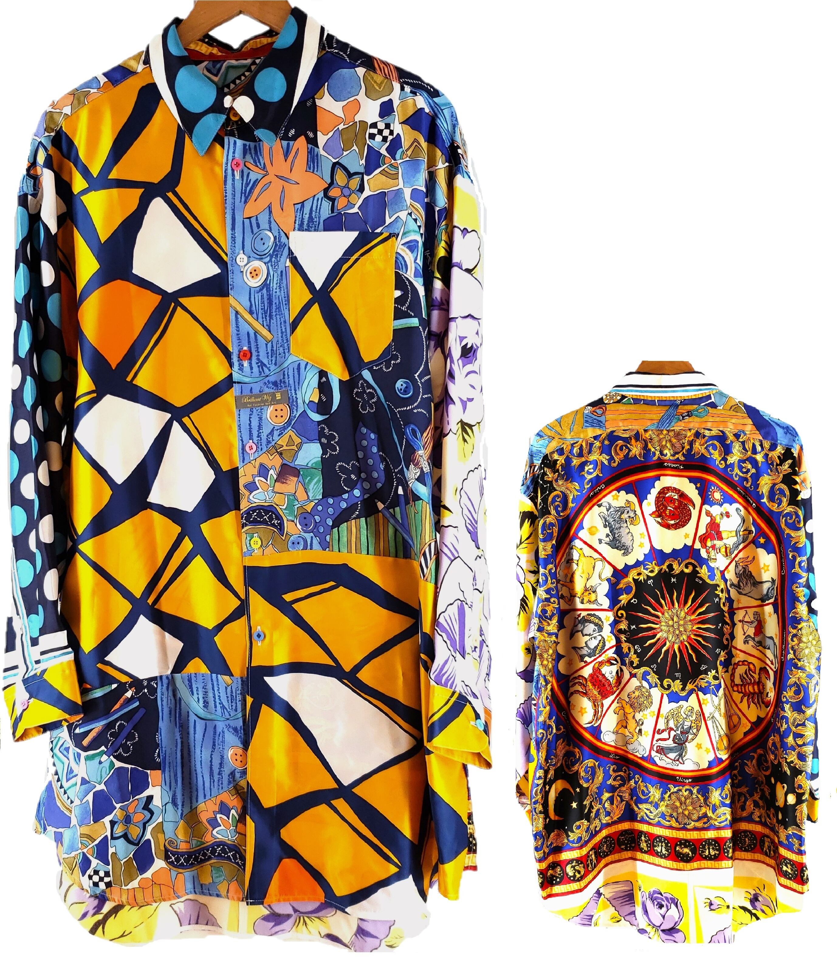 高級なスカーフを組み合わせ、背面に施された緻密な12星座のモチーフが目を引く一枚です。一方、前面のシンプルなオレンジカラーは、見る者を魅了します。70年代のポップな雰囲気と宇宙を感じさせるデザインが特徴であり、贅沢にも超貴重なスカーフを使用しています。そのため、話題の的として人々の注目を集め、ますます価値の高まる作品です。