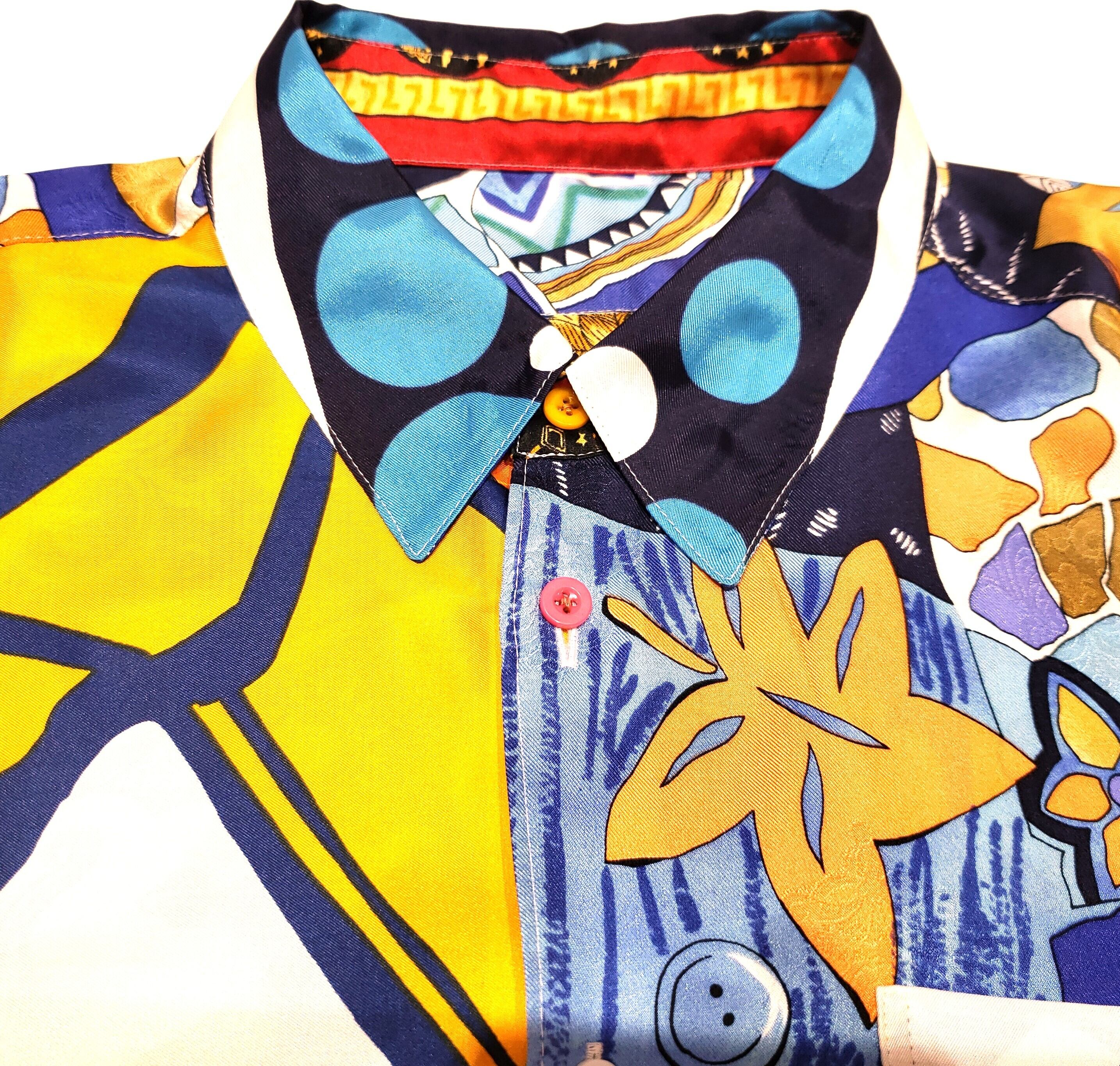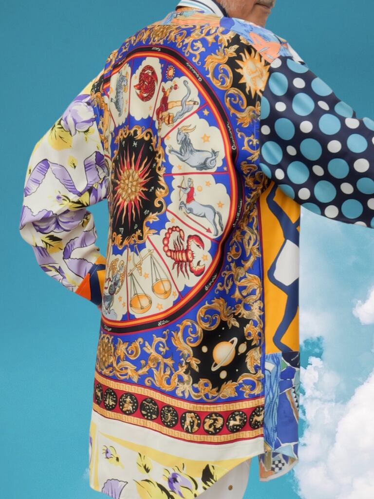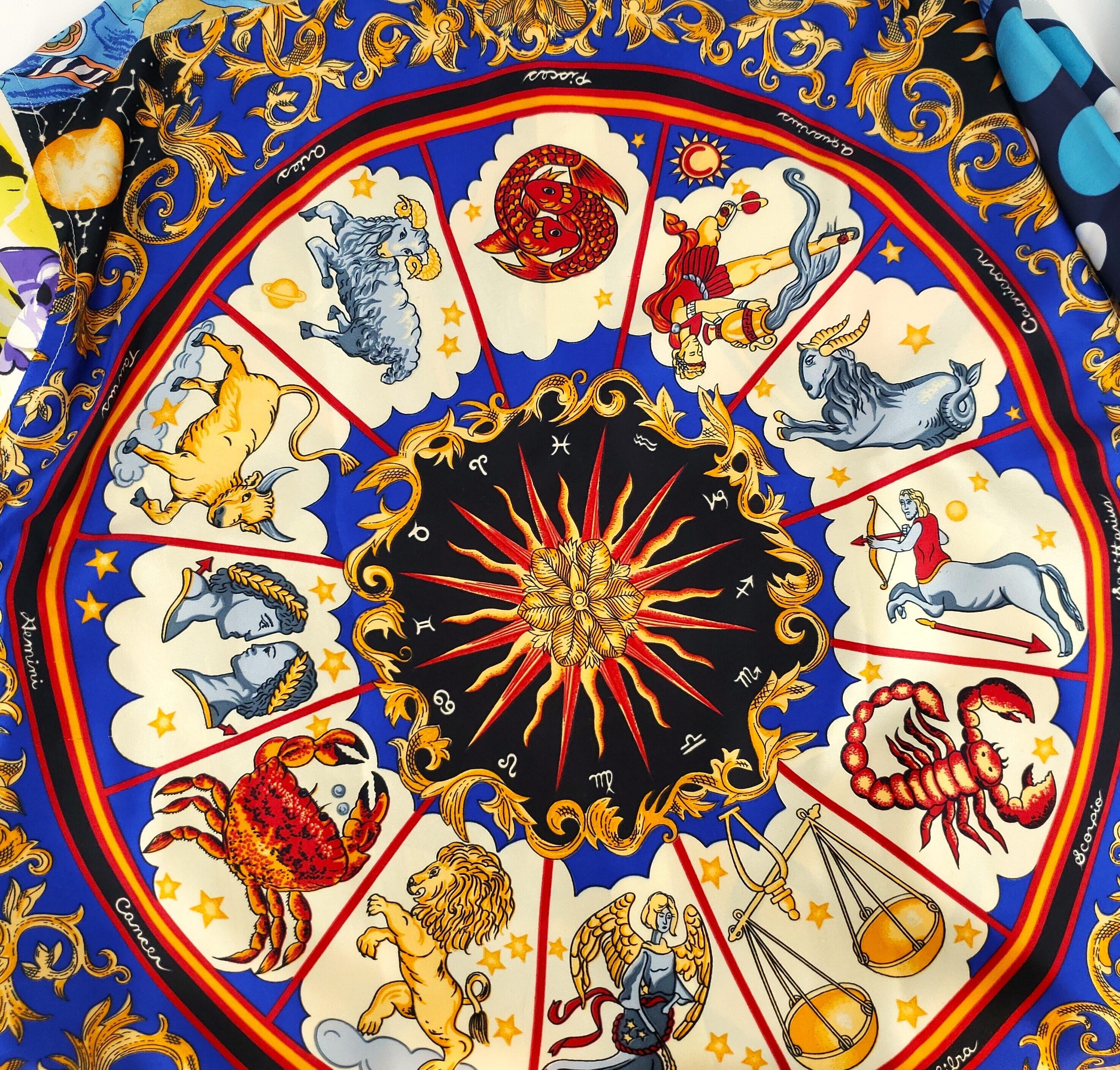 高級なスカーフを組み合わせ、背面に施された緻密な12星座のモチーフが目を引く一枚です。一方、前面のシンプルなオレンジカラーは、見る者を魅了します。70年代のポップな雰囲気と宇宙を感じさせるデザインが特徴であり、贅沢にも超貴重なスカーフを使用しています。そのため、話題の的として人々の注目を集め、ますます価値の高まる作品です。