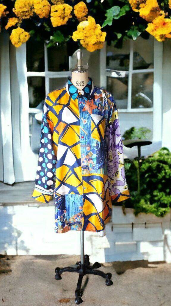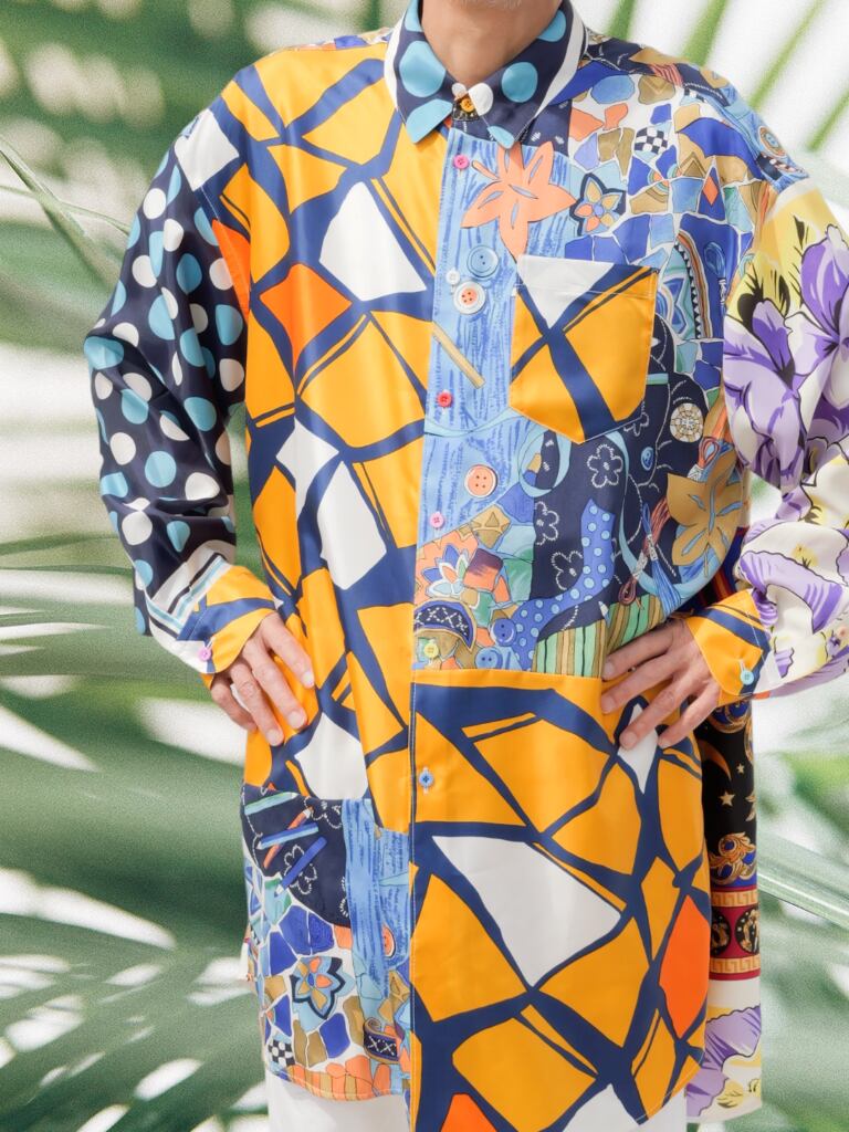 ヴィンテージスカーフを組み合わせてアートとして生まれ変わった、世界に一つだけの「身に纏うアート/クロージングアート」
