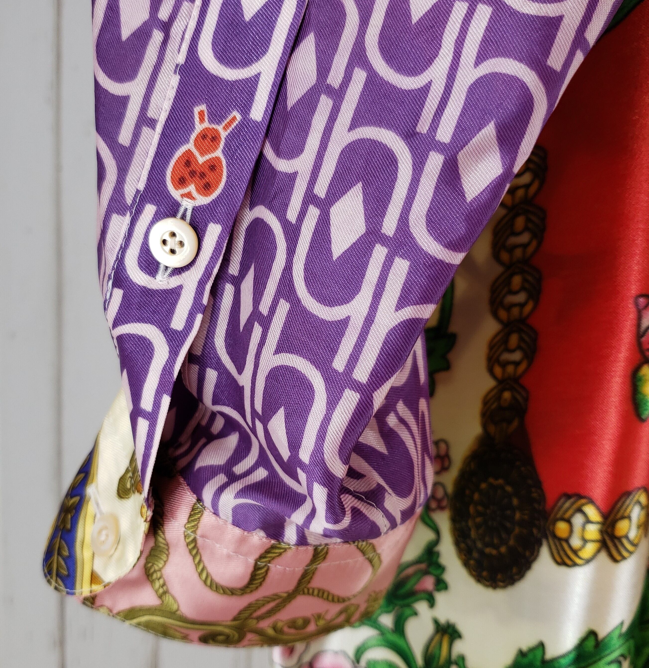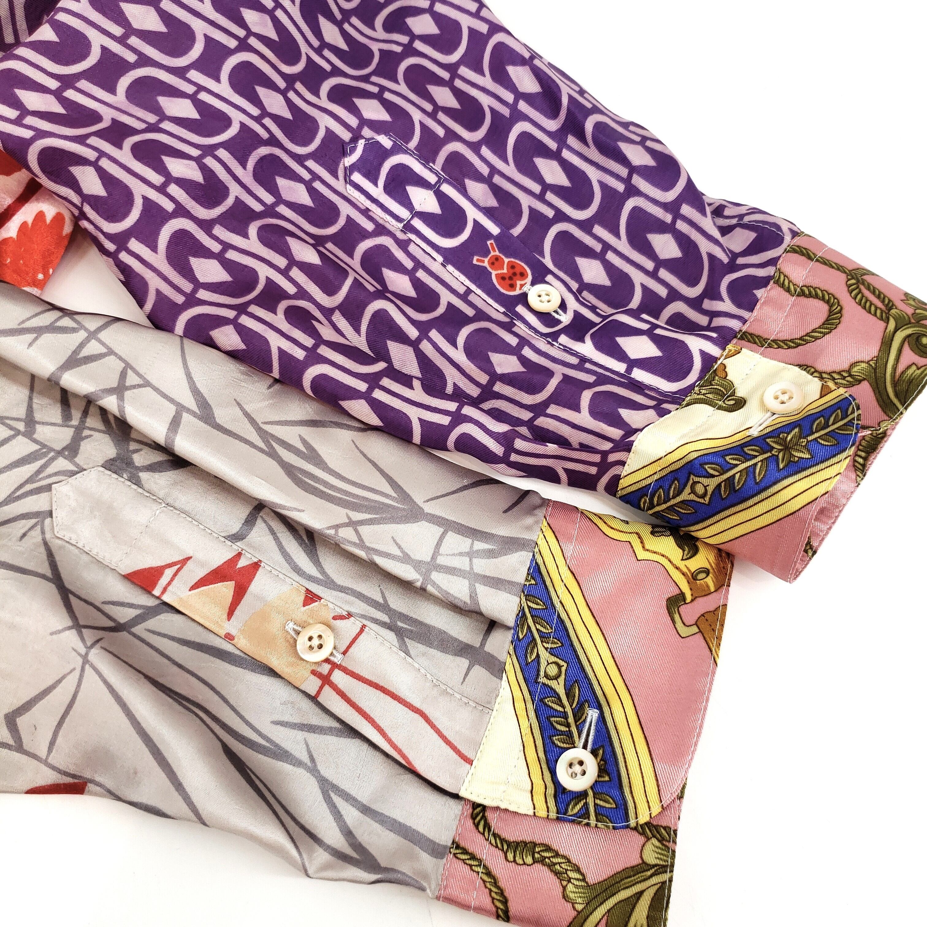 高級感漂うスカーフ達を組み合わせ春を感じさせる淡いピンクと美しい花柄が特徴。モチーフには植物や蝶が描かれ、自然への愛情が溢れる一枚です。日本の伝統的な小紋をベースに、地球上の生き物たちを愛おしく描いたアート作品は、楽しい気分になれる逸品です。