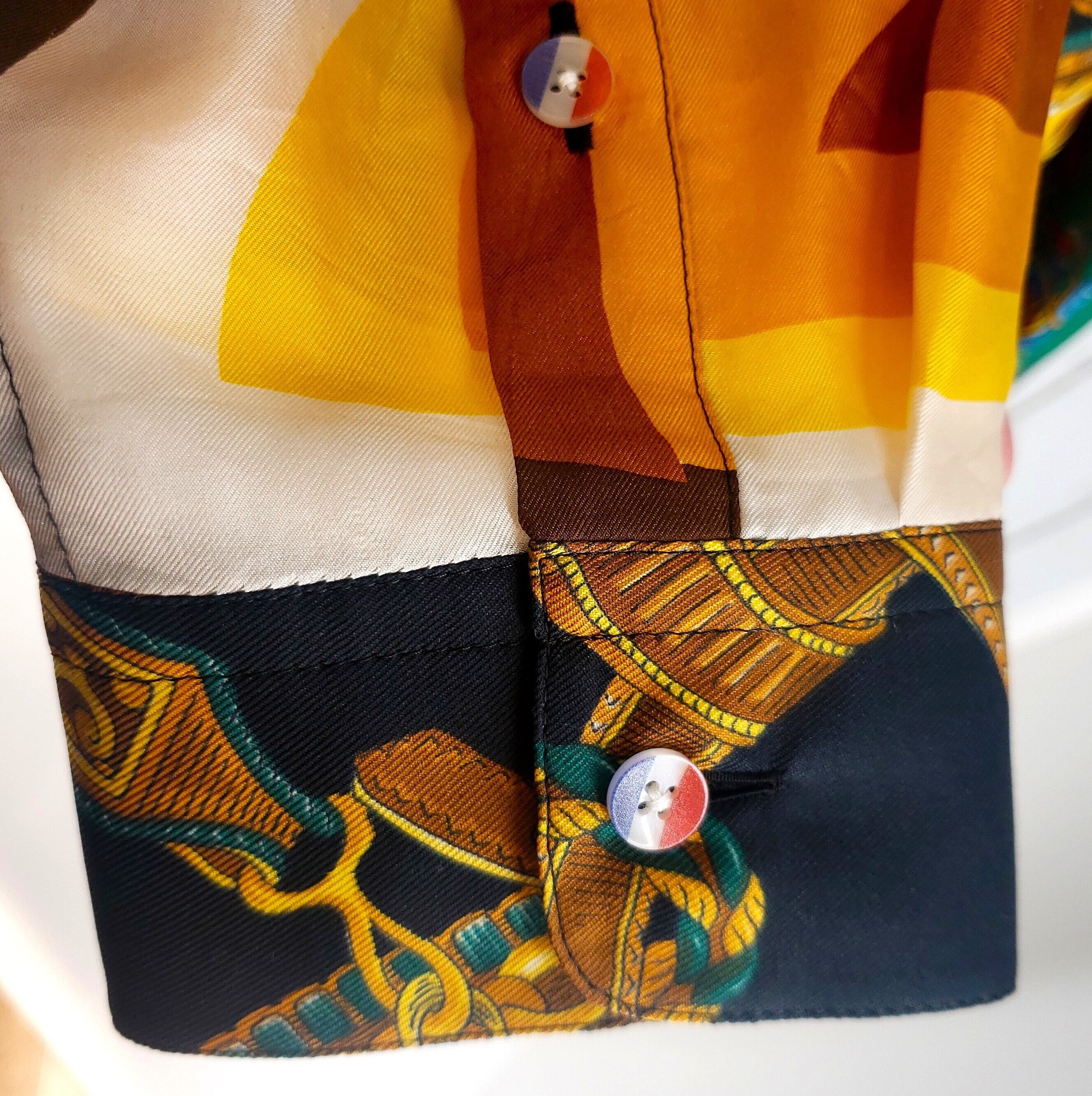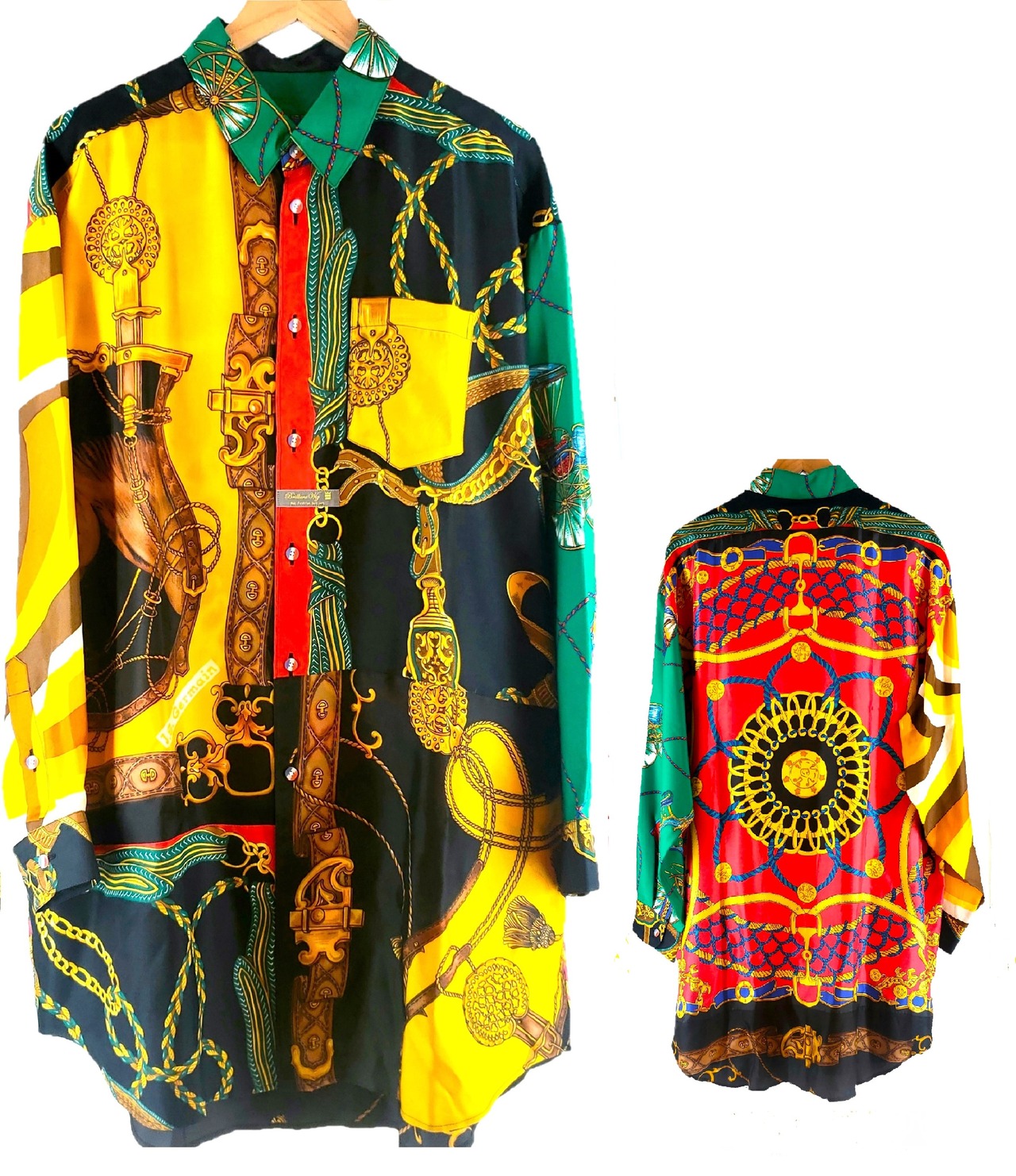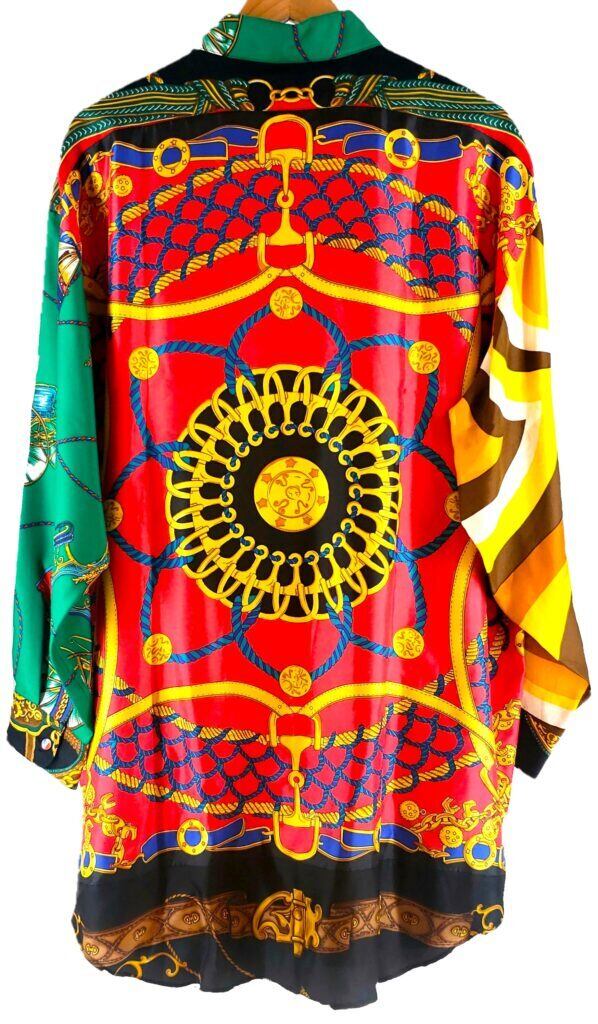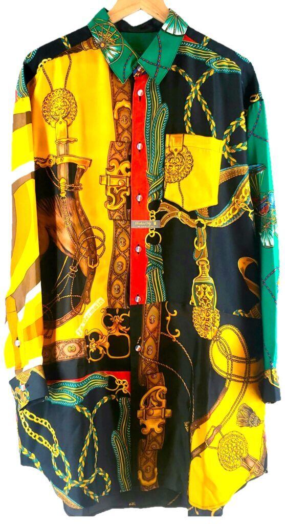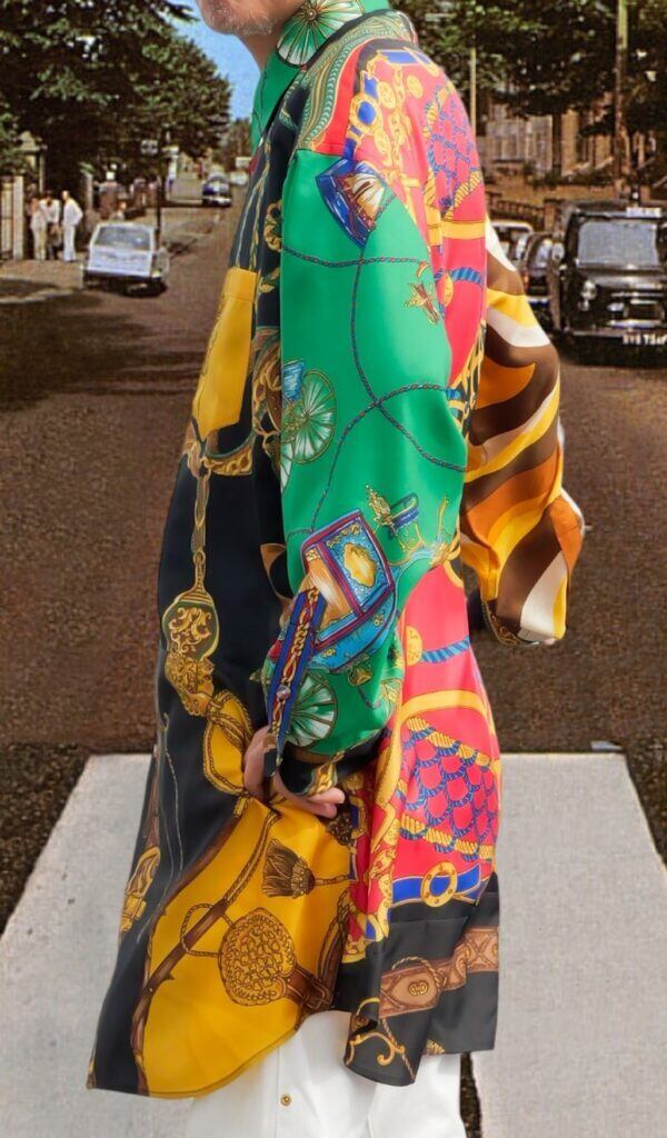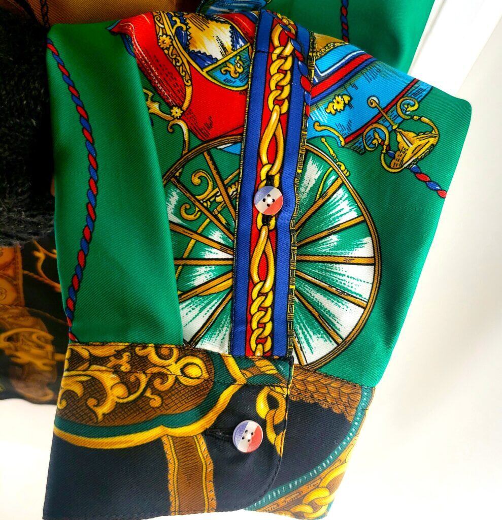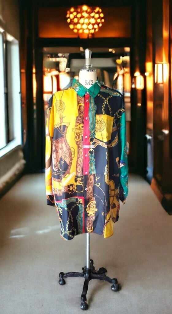 高級感漂うスカーフ達を組み合わせ、独自の色彩とパターンで華やかさと重厚感を両立させた一着です。熟練の職人が仕上げました。それぞれのスカーフが持つ個性を活かし、絶妙なバランスで調和させた一着は、まさにファッションとアートの融合体。着るだけで気分が上がること間違いなしです。