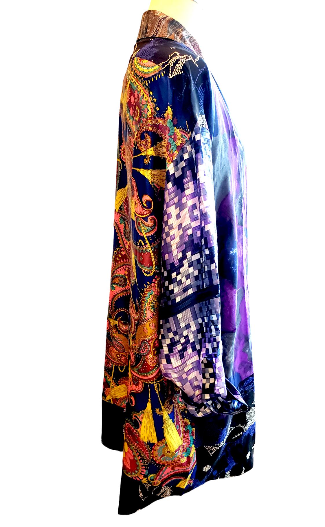 ユニークなアート作品として360度楽しめます。前面にはシックで品のあるデザインが施され、裏面にはイエローとブルーのペイズリー柄が華やかに広がっています。どちらも、異なる雰囲気を楽しめ作品の魅力を全身で感じていただける作品です。